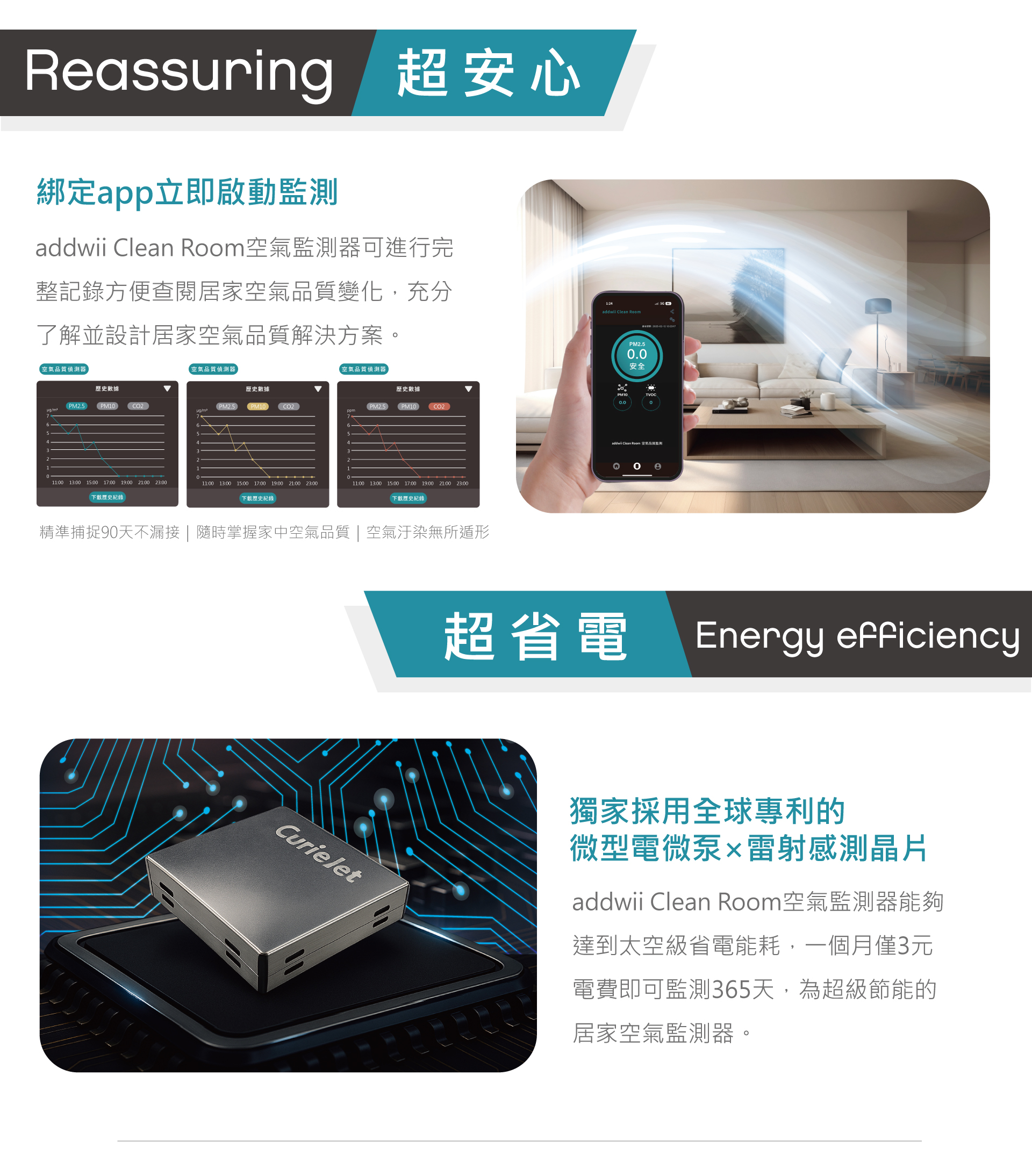 本產品 『addwii Clean Room 居家無塵室』 使用 AI 智慧控制,整個運作期間可讓多數運轉時間維持在低速運轉狀態下,以3坪使用空間環境下為例,每小時能耗30w,一天約720w (30w*24hr=720w/天),其一個月耗電量相當於耗費21.6度電。