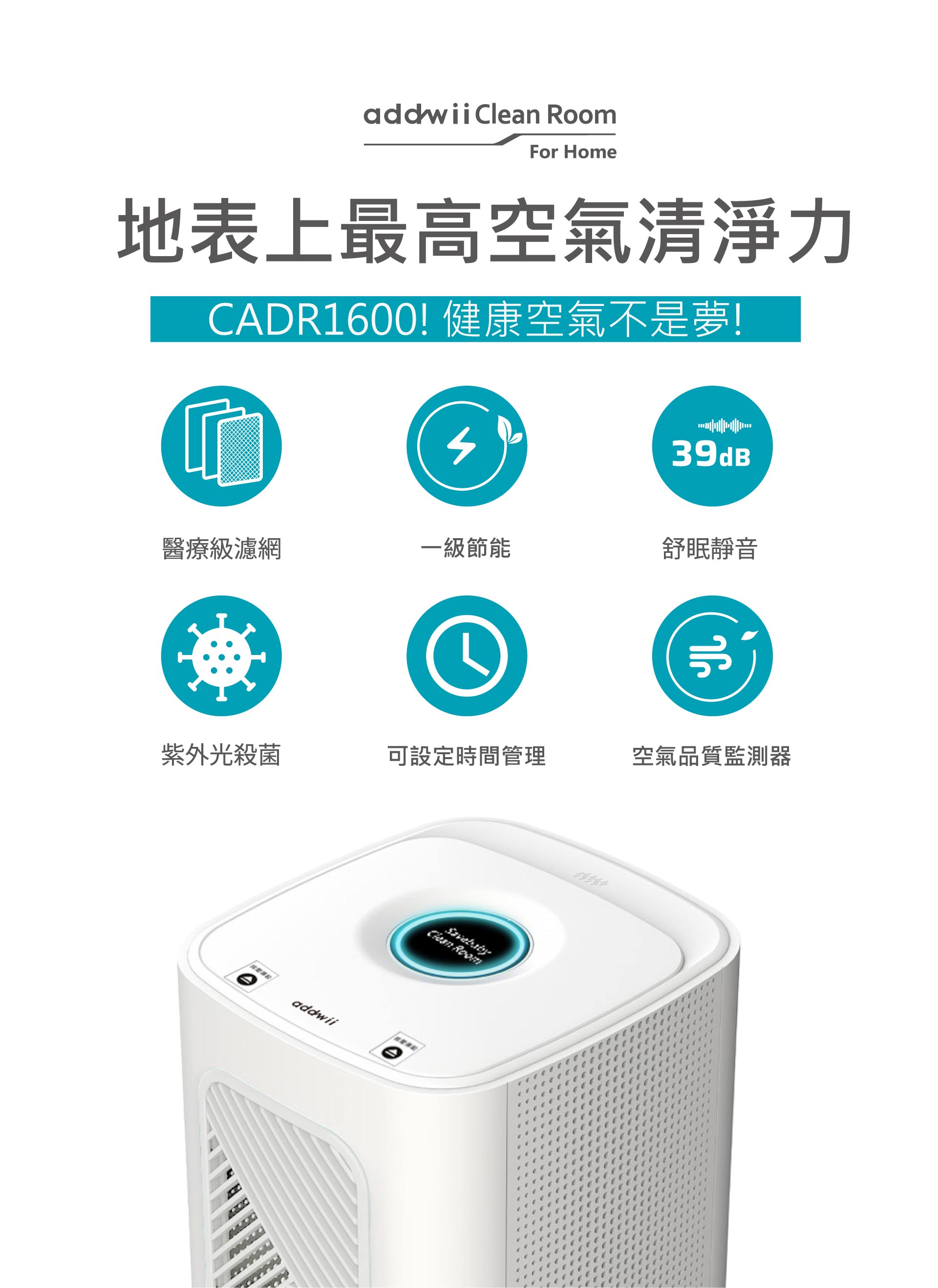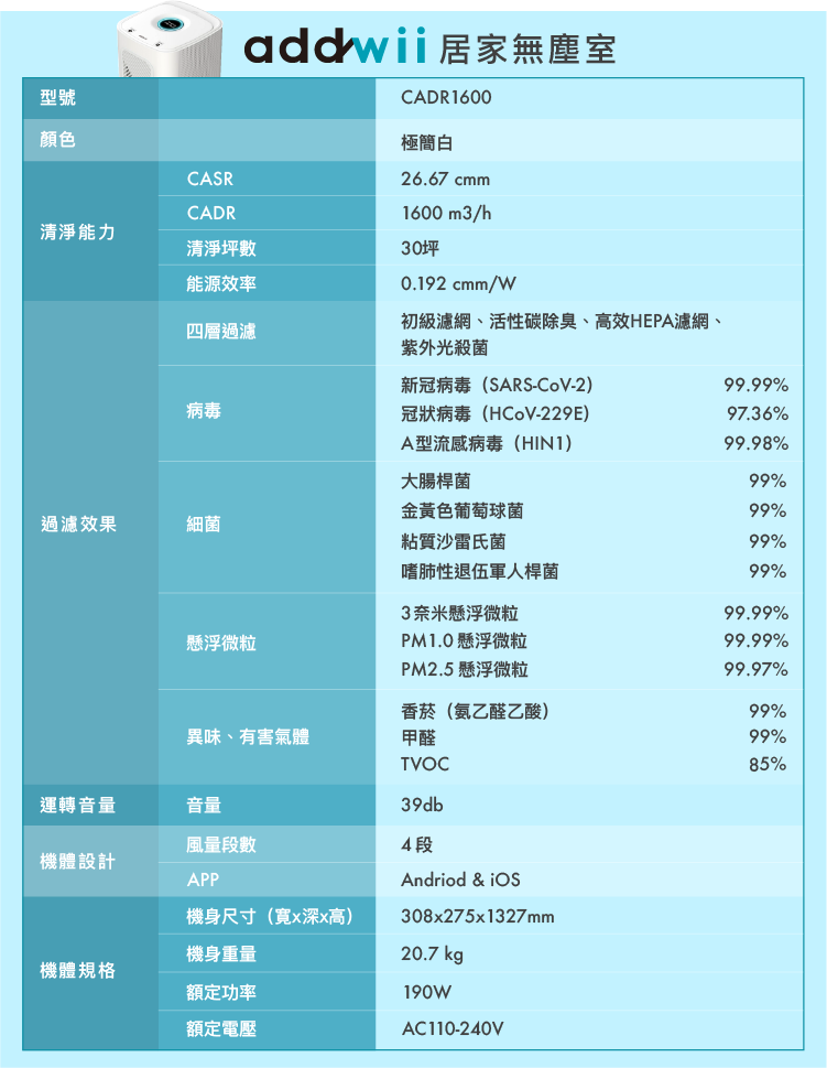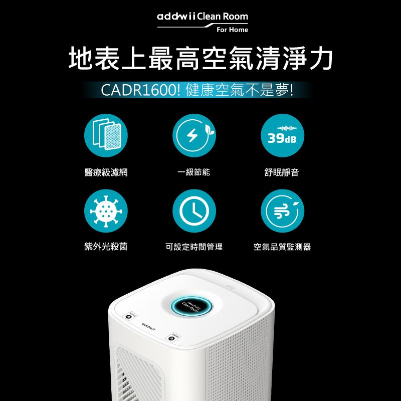 本產品 『addwii Clean Room 居家無塵室』 使用 AI 智慧控制,整個運作期間可讓多數運轉時間維持在低速運轉狀態下,以3坪使用空間環境下為例,每小時能耗30w,一天約720w (30w*24hr=720w/天),其一個月耗電量相當於耗費21.6度電。