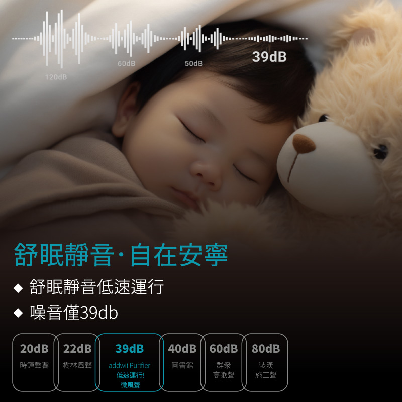 本產品一般低速運轉時,其分貝值約為39dB,是歸類於白噪音等級,此聲音不會影響到聽覺,甚至還會有幫助睡眠效果,然而當產品處於高風速運轉時,其聲音會比較大聲,但是高速運轉狀態會快速回歸至低速運轉狀態。