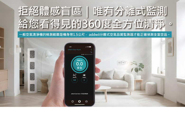 透過手機安裝『addwii Clean Room 居家無塵室 』APP 軟體,可以隨時查看環境內空氣品質狀況。