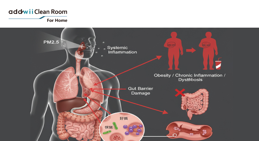 研究指出,PM2.5 微粒不僅會進入肺部,也會隨後經由血液循環或吞嚥進入消化系統,引發連鎖反應: